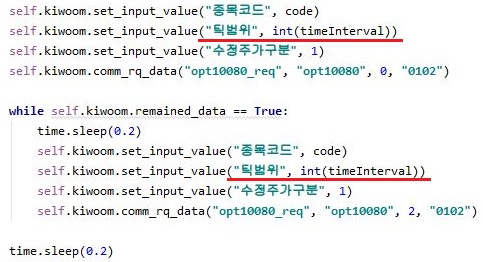 첫번째 시도는 위 스크린샷처럼 틱범위에 들어가는 변수가 문자열 형태라서 이러는 것인가 싶어서 한번 int함수를 써서 일부러 숫자로 바꾸어 주는 작업을 해 보았습니다.