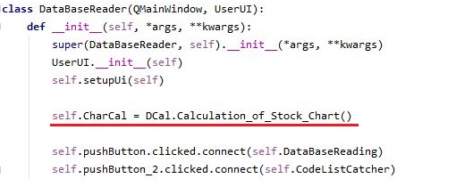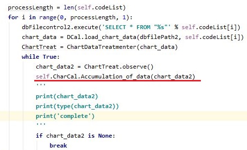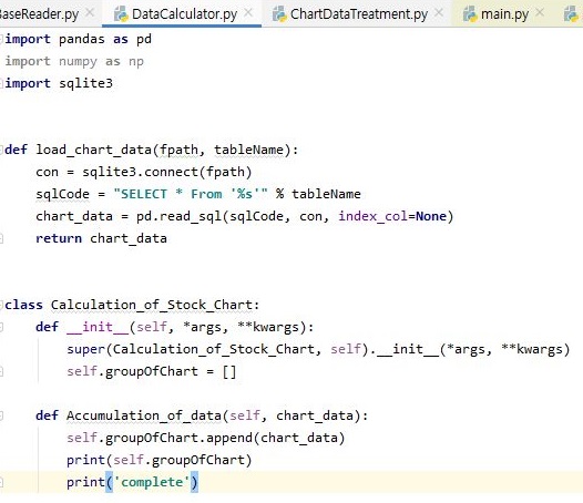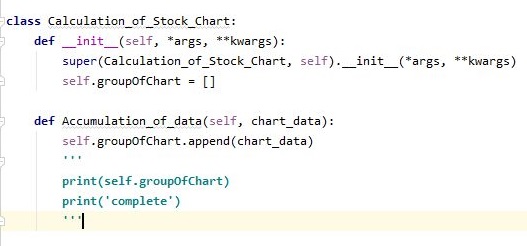 먼저 이 작업을 하기 위해서, DataCalculator.py에 새로운 클래스를 하나 만들어 주도록 합니다. 그리고 나서 이 클래스가 처음 시작할 때, self.groupOfChart라는 일종의 빈 배열을 하나 만들어 주도록 합니다. 지금은 이게 잘 생각이 나지 않는데, 얘네가 바로 하나하나 건너온 데이터를 저장하는 일종의 리스트 역할을 하게 됩니다.
