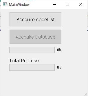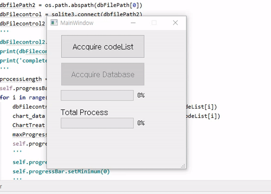 위 gif파일을 보시면, 주식의 종목코드가 입력이 되어 있는 txt파일과 데이터 베이스 파일을 짖어한 다음에, 중간에 버퍼링같은 것이 있기는 합니다만, 천천히 프로그레스 바가 올라가다가 순식간에 100%로 채워져 버리는 것을 볼 수 있습니다. 이렇게 해서 일단 유저 인터페이스에서 추가할 것은 제대로 추가가 되기는 되었습니다.