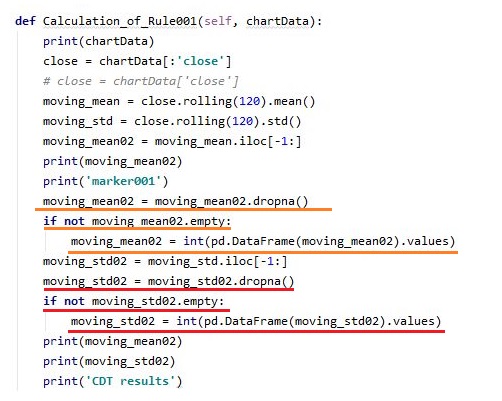 이 작업을 위해서 위 스크린샷의 오랜지색 줄에서는 이동평균을, 빨간색 선에서는 표준편차를 구할 때, 데이터 프레임이 비어있다 - empty인지 아닌지를 한번 구분해서 작업을 하도록 만들어 줍니다.