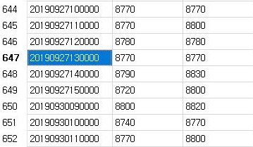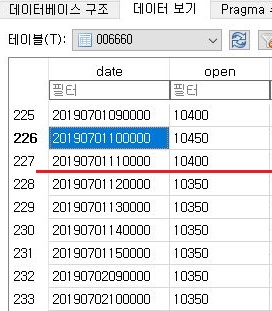먼저 첫 번째 결과를 한번 살펴 보도록 합니다. 여기서 나오는 결과로 일단 2019년 7월 1일 11시의 현재가가 나온 결과와 실제 데이터 베이스가 일치하는 지 살펴보고자 합니다.