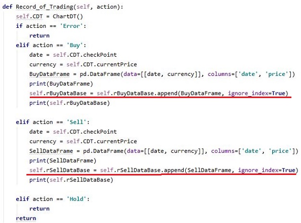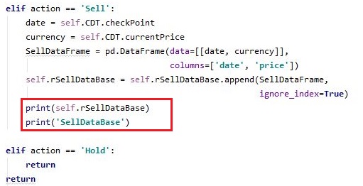그리고 나서 작업이 실제로 일어나는 시점 - 그러니까 실제로 매수/매도 결정이 나와서 이 결과를 기록해야 하는 시점이 오면, 위 스크린샷에서 볼 수 있는 것처럼 일단 append를 써서 집어 넣도록 합니다. 그리고 print함수를 써서 한번 표기가 될 수 있도록 합니다.