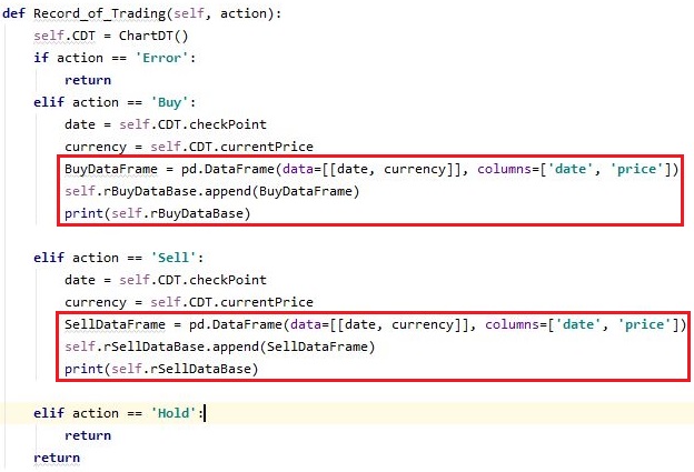 그리고 나서 다음으로 해야 할일은 위 스크린샷의 내용처럼 일단 데이터 프레임을 만들어 주도록 합니다. 여기서 매수와 매도 시점에서 나온 데이터를 저장하는 역할을 합니다.