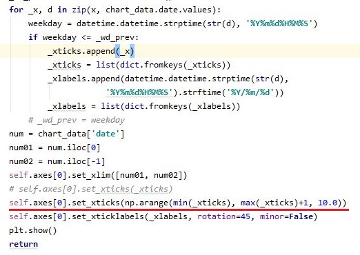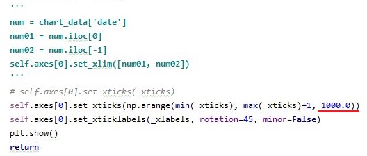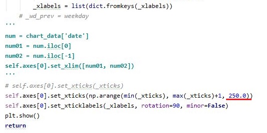 이게 어디가 문제인가 했더니, 문제는 이 레이블을 저장한 리스트에 있었습니다. 이 문제를 해결하려면 리스트에서 내용물을 일정 단위로 잘라내야 하는데, 문제는 이렇게 까지 정성을 들이는 것 치고는 결과물도 시원찮은 상황이 계속해서 이어진다는 것 입니다. 그래서 하는 수 없이 x축을 날짜로 하지 않고, 대신에 인덱스로 대체하기로 했습니다.