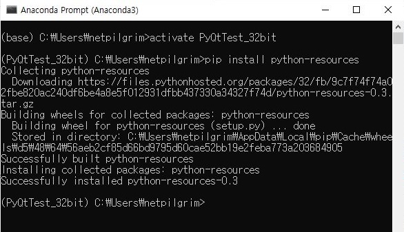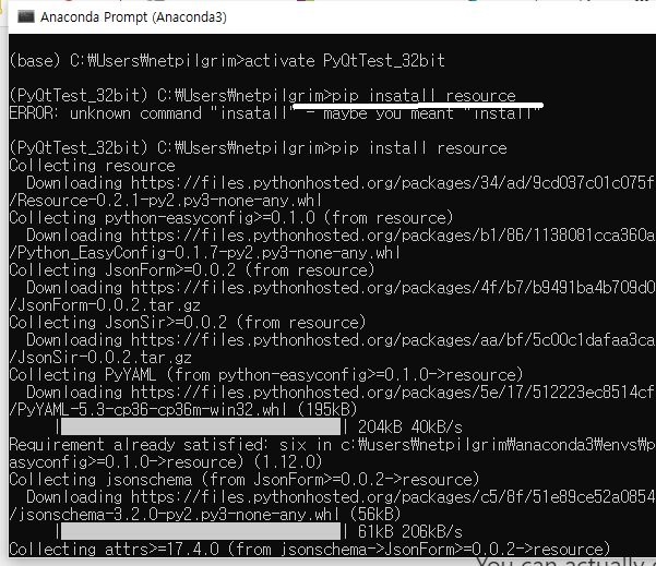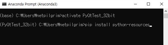 그래서 그냥 시행착오법으로 알아내기 상당히 어렵다는 생각이 들어서, 한번 자료를 검색해 보니, resource라는 파이썬 모듈을 사용하면 된다는데, 일단 위 스크린샷처럼 아나콘다 프롬프트에서 pip를 이용해서 해당하는 라이브러리를 가지고 오도록 합니다.