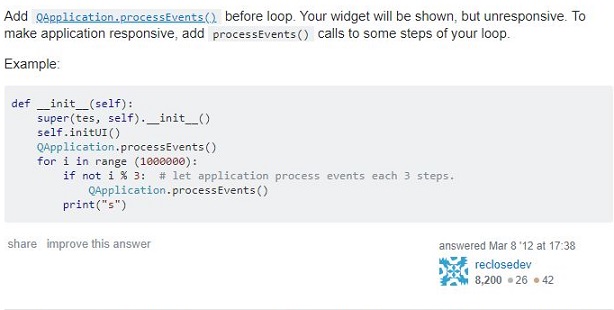 먼저 인터넷을 뒤지다가 위 스크린샷처럼 QApplication.processEvent()라는 명령어를 for루프-문이나 이런 반복문에 넣어줘야 반응을 기다리는 상태가 된다고 합니다.