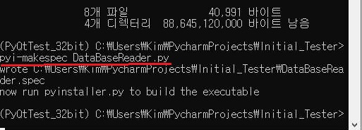 그리고 나서 프로젝트가 있는 폴더로 가서, 위 스크린샷과 같이 pyi-makespec 메인이되는 py파일.py 라고 붙여서 스펙파일을 만들어 주도록 합니다. 사실 스펙파일 (spec file)은 없어도 상관이 없습니다. 다만 지정해야 하는 옵션이 아나콘다 프롬프트 상에서 너무 많아지기 때문에, 이걸 일일히 입력하지 않고, 미리미리 스펙파일에 지정을 해 주는 것이라고 보면 편합니다.