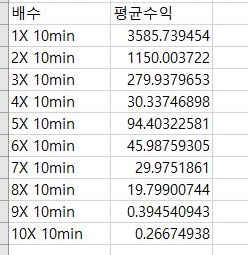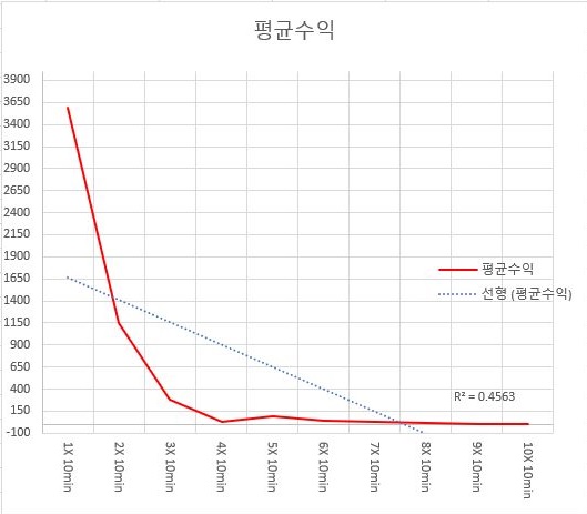 먼저 나오는 평균수익인데, 일단 같은 10분봉을 가지고서 한번 작업을 하는 것은 좋기는 좋은데, 문제는 R제곱의 값이 그리 높지 않다 = 거의 연관성이 없다는 것만 알 수 있었습니다. 사실은 4배 까지는 어떻게 좋게 봐줘서 의미있게 감소가 일어나기는 했는데, 그 이후로는 큰 차이가 없다는 것을 알 수 있었습니다.
