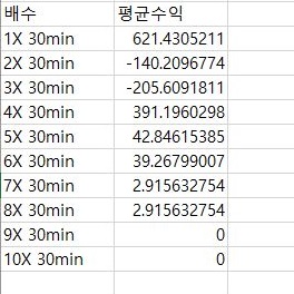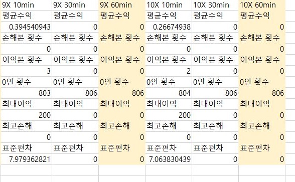 이렇게 해서 먼저 10분봉 캔들차트를 가지고서 한번 작업을 하기는 했습니다. 이 결과를 가지고서 한번 가지고 가는데, 일단 평균수익과 비교를 해 보도록 합니다.