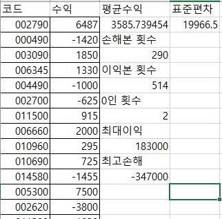 먼저 위 스크린샷과 같이 각각의 조건에서 초기 테스트를 한 결과를 가지고서 한번 엑셀에 테이터 베이스 파일에 있는 내용을 옮긴 다음에, 이를 가지고서 평균수익부터 표준편차, 등등을 구해 보도록 합니다. 여기서 나오는 최대 이익과 최고 손해는 각각 max와 min이라고 최대값과 최소값으로 구했습니다.