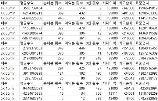 다만 5배수에 가서는 다시금 사용하는 분봉의 간격이 길어지면 길어질 수록 오히려 평균수익이 떨어지는 것을 볼 수 있었습니다.