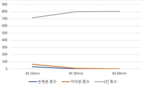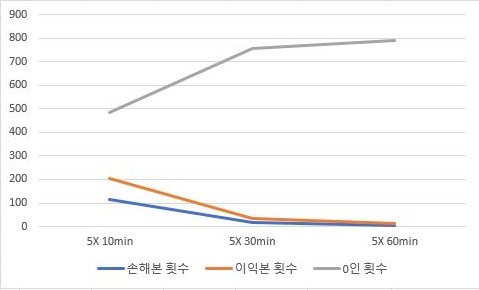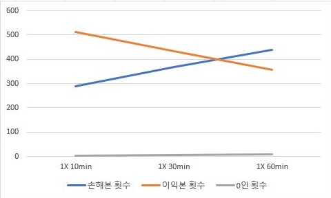 일단 1배수에서 손해와 이익을 본 경우인데, 이 경우에는 특이하게도 10분봉을 사용한 경우가 가장 좋은 성과를 내는 것을 볼 수 있었습니다.