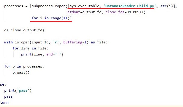 그리고 나서 다음으로 해야 할일은 위 스크린샷처럼 processes라는 복잡한 변수를 만들었는데, 별거 없이 일단 sys.executable이라는 것은 시스템내에서 뒤에 오는 py파일을 실행시킬 수 있는 합당한 환경이 있으면 자동으로 찾아준다는 명령입니다. 그리고 나서 다음에 뒤에 오는 str(i)는 이후에 오는 for문을 보고서 추론한 것인데, 일단 여러개의 자식 프로세스를 생성하기 위해서 필요한 옵션으로 보입니다.