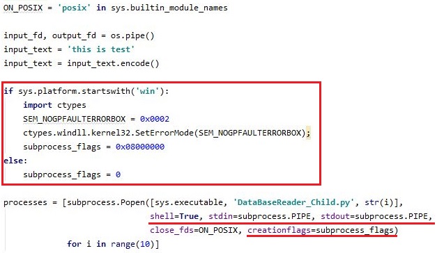 먼저 위 스크린샷에서 볼 수 있는 것처럼 일단 윈도 운영체제를 위해서 코드를 추가해 주도록 합니다. 그리고 나서 Popen에 새로운 옵션을 추가해 주도록 합니다.