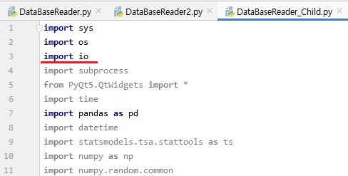 그리고 나서 다음으로 io모듈을 자식 프로세스에서도 사용할 수 있도록 한번 import를 해 주도록 합니다. 이렇게 하는 것으로 일단 작업이 일단락 되었습니다.