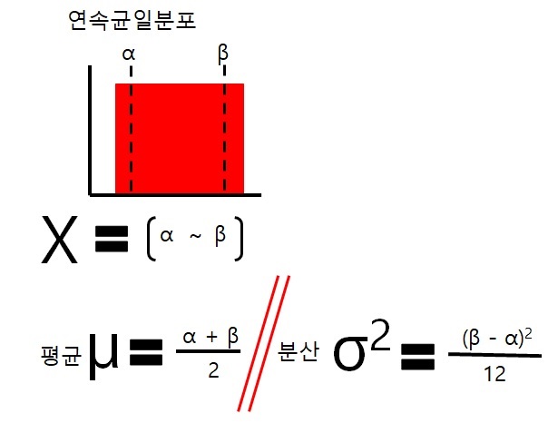 균일분포에는 위에서 언급한 이산확률변수가 분포된 분포를 보여주는 이산균일분포라는 것이 있으며, 연속확률변수가 분보된 것을 보여주는 것은 연속균일분포라는 것을 알 수 있습니다. 그리고 이 둘의 평균과 분산을 구하는 공식도 약간의 차이가 있습니다.
