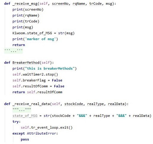 그리고 나서 위 스크린샷에서 볼 수 있는 것처럼 3개의 메서드도 더 추가를 했습니다. 물론 이 메서드들이 다 작동을 한다고는 생각할 수는 없지만, 일단 제가 kiwoom.py에 추가를 했는 메서드입니다.