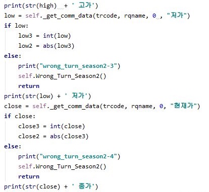 그리고 여기서 중간중간에 보이는 Wrong_Turn_Season2()라는 메서드를 자주 호출하는 것을 볼 수 있는데, 이게 키움증권 서버에서 항상 원활하게 정보가 오지 않아서 벌어지는 일이기도 합니다.