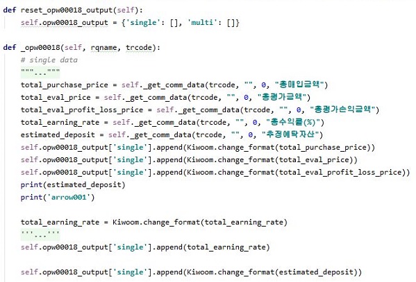 그리고 나서 위 스크린샷에서 볼 수 있는 것과 같이 일단 opw00018이라고 하는 뭐랄까 재정상태를 가지고 오기 위한 메서드를 보고 계십니다. 일단 결과가 될 self.opw00018_output을 리셋시키는 메서드와 키움증권에서 계정에 있는 재정 정보를 가지고 오기 위한 메서드의 전반부를 보고 계십니다.