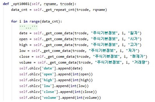 그리고 나서 위 스크린샷에서 볼 수있는 것과 같이 opt10001이라는 TR에 대해서 정보를 가지고 오기 위한 코드를 작성하는데, 이 메서드도 길어서 중간에 한번 잘라야 했습니다.