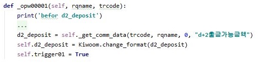 그리고 나서 opw00001이라는 TR이라고 키움증권 서버에 보내는 요청에 대한 메서드도 한번 추가해 주도록 합니다. 이렇게 했는 이유는 매수할 대 한도를 제대로 정하기 위해서 입니다.