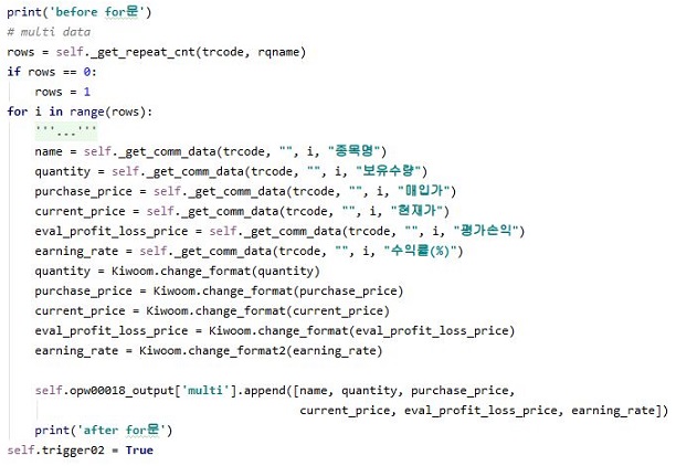 그리고 나서 어느 종목을 얼마나 보유했는지에 대해서 정보를 가지고 오기 위한 메서드의 후반부를 보고 계십니다. 이렇게 했는 이유는 opw00018이라는 TR에선느 먼저 single 데이터라고 전체적인 정보를 먼저 보내주고, 이후에 multi라고 하는 추가적인 정보-어떤 주식의 종목을 얼마나 가지고 있는 지에 대해서 보내주기 때문입니다.