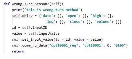 그리고 키움증권 서버에서 제대로 데이터를 보내주지 않았을 경우 호출이 되는 메서드의 2번째 버젼입니다. 이 버젼에서는 다시금 분봉차트의 내용을 다시 요청하라는 식으로 되어 있습니다.