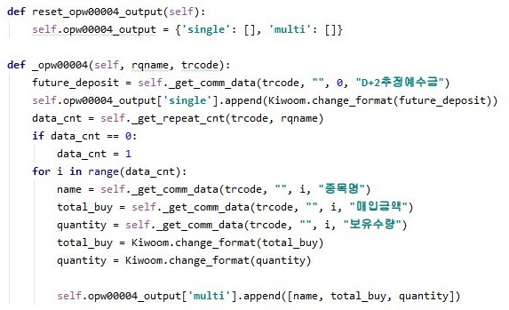 그리고 나서 2일 이후의 추정 예수금을 가지고 오기 위한 opw00004라는 TR을 목표로 해서, 여기서도 한번 메서드를 추가해 주었습니다.