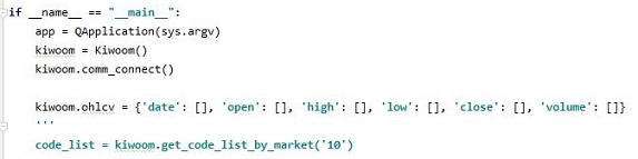 그리고 나서 if __name__ == "__main__": 이라는 것을 보시면, 그렇게 크게 차이는 없지만, 일단 아래의 부분이 주석처리가 된 것을 제외하면 그렇게 큰 차이는 없었습니다. 아무튼 이렇게 해서 짧다면 짧다고 할 수 있는데, 많은 변형이 가해진 것은 확실한 kiwoom.py 에서 제가 가해준 변형을 다 올려서 보여주었습니다. 여기서 나오는 내용을 가지고서 실습을 하려는 분들에게 도움이 되었으면 합니다.
