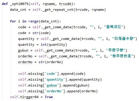 그리고 나서 미체결 정보를 가지고 오기 위해서, 위 스크린샷과 같이 opt10075라는 TR에 대해서 한번 작용을 하기 위한 메서드도 추가해 주도록 합니다.