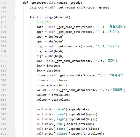 그리고 나서 다음으로 opt10080이라는 분봉차트를 가지고 오라는 메서드에 대해서 본격적으로 정리하는 작업을 시작하도록 합니다. 일단 이 경우에는 어찌된 셈인지 -값이 키움증권 서버에서 전송이 되는 경우도 있는데, 이러한 경우 때문에 int()함수로 숫자로 바꿔준 다음에 abs()로 절대값으로 바꾸어 주어야 합니다.