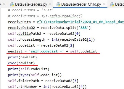 그런데 제대로 자식 프로세스가 실행이 되지 않는 현상이 발생했습니다. 이걸 어떻게 해결하느냐 하면, 먼저 list를 str형식으로 바꾸었다가 다시 list형식으로 바꿔야 하기 때문에 발생하는 문제입니다. 일단 작업을 하기 위해서 위 스크린샷처럼 한번 만들어 주도록 합니다. 이 방법은 변수 = '기존의 str형식이 된 list의 변수명 =' + 기존의 str형식이 된 list의 변수명 이라는 형식으로 지정을 해 주고, exec(변수)라는 함수를 실행시키는 것으로 완성이 됩니다.