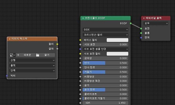 그리고 나서 지난번 포스팅에서 언급한 것과 같이 일단 노드를 불러 오도록 합니다. 그리고 이미지 텍스쳐에서 UV 그리드를 생성한 다음에, 여기에 있는 컬러를 베이직 컬러와 연결하도록 합니다.
