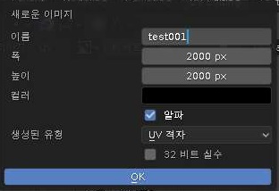 일단 이렇게 된 김에 UV 맵에서 새로운을 눌러서, 새로운 이미지를 한번 생성해 보도록 합니다. 여기서 나오는 것은 일단 UV격자입니다.