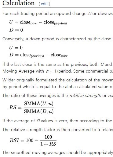 일단 위키피디아의 영문 자료를 뒤져 보다 보니, 우선 close라고 해서 종가의 변화가 중요한데, 어제보다 종가가 오른 경우와 반대의 경우를 각각 U와 D라는 그룹으로 묶도록 하고, 이후에 Wilder's SMMA라고 하는 특별한 공식의 이동평균을 구해야 하는 과정이 있습니다. 이게 조금은 복잡하기는 해도 어떻게 계산을 해야 하는가 하고 생각했더니.........