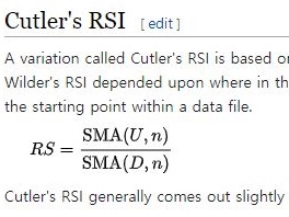 이 RSI지수를 간단하게 그냥 U와 D의 이동평균선을 사용해서 계산하는 방법이 커틀러의 계산법입니다. 이 방법은 100% 오리지날의 계산식과 같지는 않지만, 매우 유사한 결과를 낼 수 있어서 통상적으로는 이 공식을 사용하는 것으로 보입니다.
