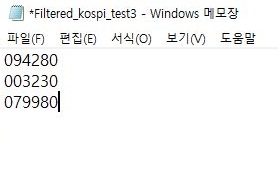 일단 해당하는 종목들을 위 스크린샷에서 보이는 것처럼 우선 새로운 txt파일에 두고나서, 여기서 한번 테스트에 들어가 보도록 합니다.