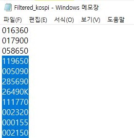 그리고 나서 새로운 txt파일에 위 스크린샷과 같이 복사한 코스피 종목 코드의 리스트를 가지고 가서, 한번 작업에 이용해 보도록 합니다.