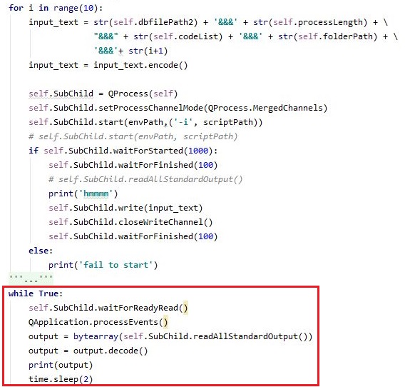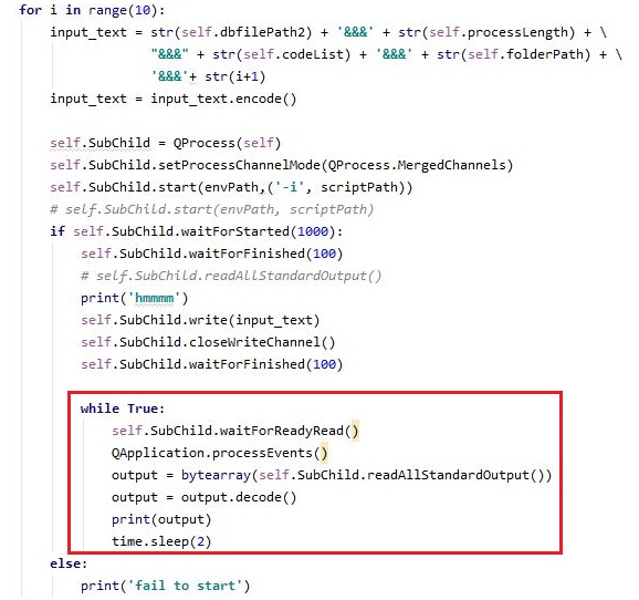 그래서 아예 이번에는 위 스크린샷에서 볼 수 있는 것처럼 while문이 아니라 QTimer를 이용해서 2초마다 계속해서 자식 프로세스에서 나오는 결과를 읽어 들이는 것이 가능하도록 만들어 줍니다.