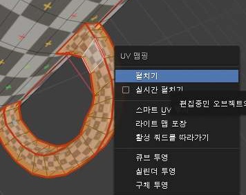 그리고 나서 U키를 눌러서 UV 맵핑 메뉴를 불러 오도록 합니다. 그 메뉴에 있는 펼치기 메뉴를 선택해서, 다시한번 UV맵핑을 시키도록 합니다.