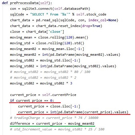 그리고 나서 다음으로 넘어가게 되는 메서드인 preProcessData라는 메서드에 대해서 한번 살펴 보고자 합니다. 일단 여기서 현재가를 가지고 와야 하는데, 만약 이게 0원이다 = 현재가에 대한 정보가 키움증권 서버에서 오지 않았다로 간주하고 데이터 베이스에서 읽어 들이라는 식으로 계산을 하게 했습니다.