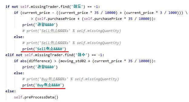 그래도 일단 find라는 함수를 사용해서 미체결 거래가 있으면, 거래취소 명령을 내리라고 코드를 짰습니다. 그런데 결과적으로 말하자면, 이게 다 쓸모없는 노력이 되었습니다.