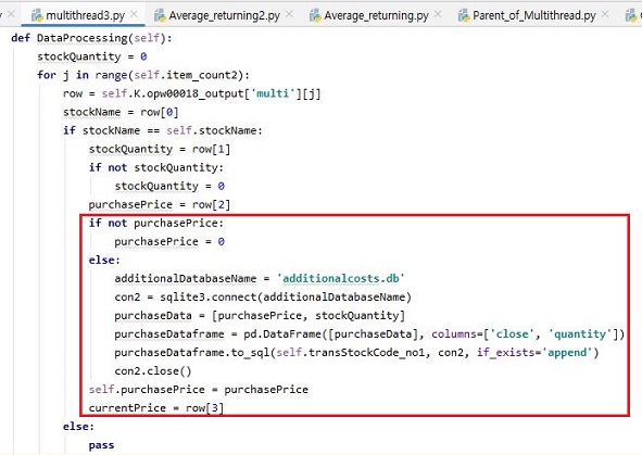 먼저 시작부인데, 여기서 가장 중요한 것은 input() 이라는 함수입니다. 이 함수가 있어야 subprocess에서 communicate()함수로 입력한 내용을 넣어줄 수 있기 때문입니다. 그리고 나서 기존에 만들어 주었던 average_returning.py와 다른점이 무엇이냐고 하면, 일단 미체결 수량에 대한 고려를 하는 missingQuantity와 missingTrade라는 변수등이 추가가 되었고, 그 다음에는 TreatmentOfMissing()이라는 함수가 추가된 것 입니다.
