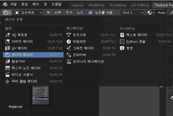 다음으로 해야 할일은 윗쪽 윈도우를 위 스크린샷에서 볼 수 있는 것처럼 세이더 에디터라는 항목으로 바꾸어 주는 것이라고 할 수 있습니다.