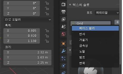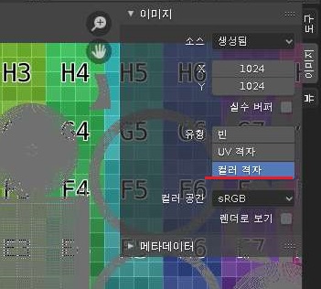 그리고 한번 좌측에 있는 텍스쳐 맵이라고 할 수 있는 데로 가서, 여기다가 N키를 눌러서 뜨는 매뉴에 컬러격자를 선택해 주도록 합니다.