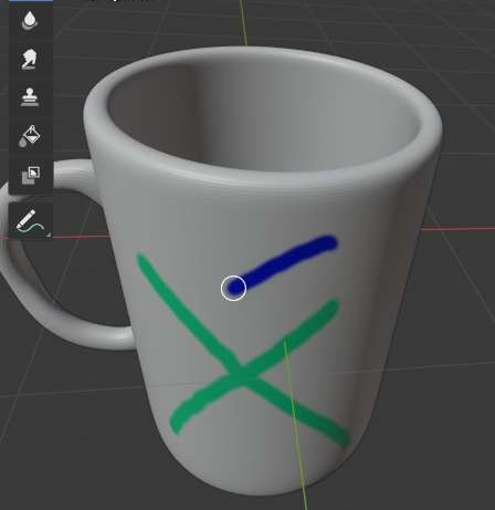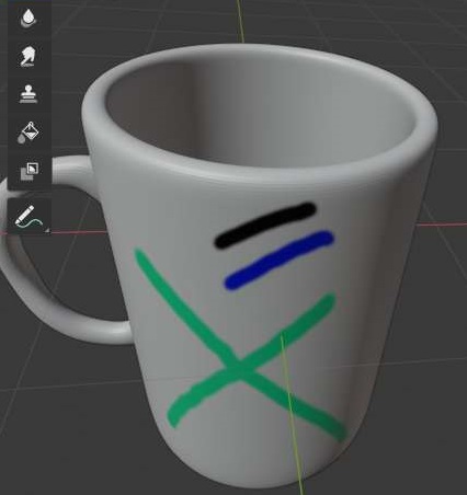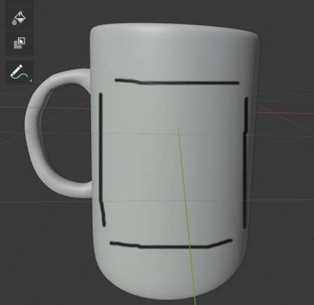그리고 나서 한번 머그컵에다가 하나 그려보도록 하면, 위 스크린샷에서 볼 수있는 것처럼 선이 하나 그어지기는 집니다. 그리고 나서 좌측에 있는 UV 맵으로 가면........