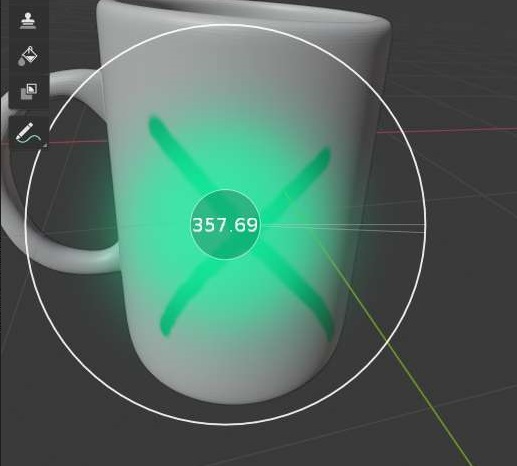 먼저 F키를 누르게 되면, 사용할 수 있는 브러쉬라고 해서, 3차원 물체에 색상을 입힐 수 있는 일종의 붓의 크기가 변경이 가능하게 됩니다. 물론 이걸 일일히 입력해서 변경해도 되지만, 직관적으로 이렇게 하는 것이 더 편리라리라 생각합니다.