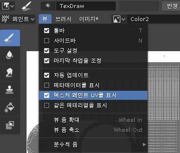 위 스크린샷에서 보이는 뷰라는 메뉴를 눌러서 텍스쳐 페인드 UV를 표시라는 항목을 그냥 선택해제를 해 주도록 합니다. 이렇게 하면........