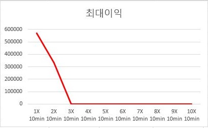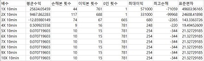 우선 평균수익이 어떻게 변했는지 보아야 하는데, 그 결과가 10개의 분봉을 가지고서 10분봉 캔들챠트를 가지고서 얻은 결과에서는 3배수 이상 부터는 수익이 어마어마 하게 감소하는 것을 볼 수 있습니다.