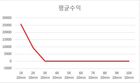 우선 평균수익이 어떻게 변했는지 보아야 하는데, 그 결과가 10개의 분봉을 가지고서 10분봉 캔들챠트를 가지고서 얻은 결과에서는 3배수 이상 부터는 수익이 어마어마 하게 감소하는 것을 볼 수 있습니다.